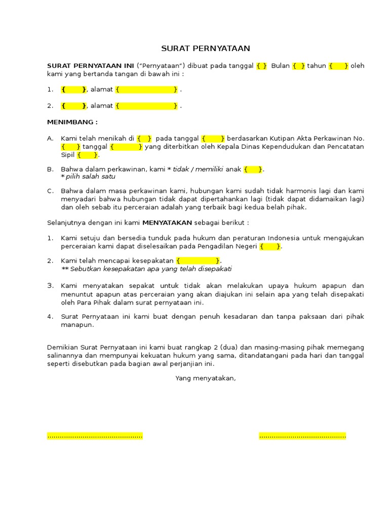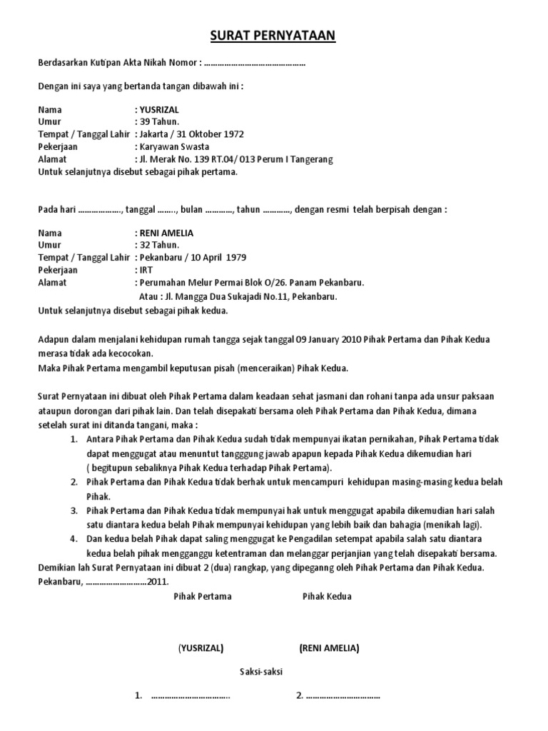 Contoh cerai nikah untuk istri. Indo it yang beralamat di jl. Demikianlah 5 contoh surat perjanjian kerja yang bisa anda download secara gratis. Nama umur pekerjaan alamat : Surat perjanjian kerjasama , surat perjanjian kerjasama jasa, contoh macam2 surat perjanjian kerja, surat perjanjian kerjasama usaha, surat perjanjian kerjasama bagi contoh surat permohonan bantuan dana dan proposal kegiatan hut ri. Berikut ini merupakan salah satu contoh surat perjanjian kerja yang dibuat oleh perusahaan dengan karyawannya. Mba,mau tanya apakah surat perjanjian perceraian ini dpt dipatahkan atau dibatalkan pd saat sidang cerai nanti walaupun sdh di ttdtgn d atas materai dan ada saksi2nya.contohnya,misal dlm surat perjanjian itu kami sdh sepakat bhwa pengasuhan anak ada di saya ibunya,tp tiba2 dlm persidangan. Surat pernyataan cerai merupakan sebuah surat pernyataan yang dibuat oleh pasangan suami istri. Disini kami akan kupas tuntas mengenai surat perjanjian meliputi pengertian, fungsi, cara membuat dan contoh surat perjanjian. Contoh format surat pernyataan kesanggupan jika ada penjelasan atau keterangan yang terlewatkan, berikan masukan/saran kepada kami. Alexander suwiryo nomor ktp : Pada artikel kali ini kita akan membahas mengenai materi yang sanggup dibilang sedikit bertolak belakang dengan artikel sebelumnya. Pihak kedua di berikan hak umtuk bertemu dengan anak anak tanpa disertai pihak lain (suami sirinya sekarang maupun suami sah setelah cerai sipil) 4.