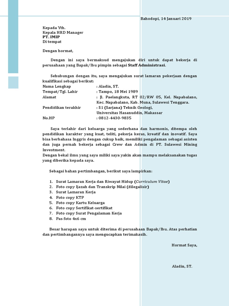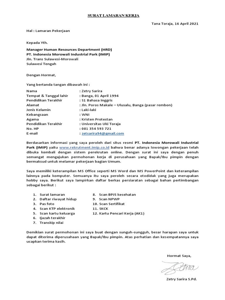 Berikut saya lampirkan surat lamaran, cv, scan ktp, ijazah, dan sertifikat dan pas foto. Surat lamaran pekerjaan adalah surat permohonan yang ditulis oleh seorang pencari (pelamar) kerja yang dikirimkan kepada instansi atau perusahaan guna mendapat pekerjaan sesuai lowongan pekerjaan yang ditawarkan. Disertai contoh surat lamaran kerja via email dan surat lamaran pekerjaan dengan riwayat hidup dan terpisah. Kabupaten morowali memiliki potensi sumber daya nikel yang cukup besar sehingga punya prospek untuk mengembangkan industri misi yang diemban pt imip dalam menjaga operasi secara berkelanjutan (sustainable) dan dalam mengembangkan kawasan industri, adalah Materi surat lamaran pekerjaan terlengkap:
